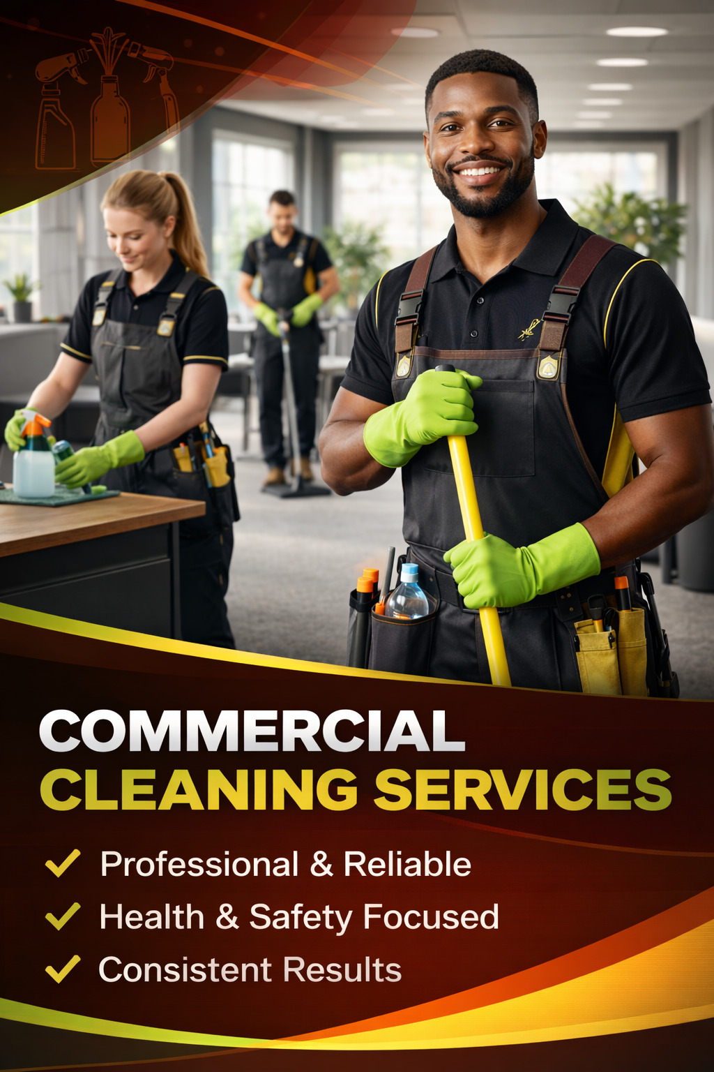 What We’re About We’re a commercial cleaning company built for businesses that want a clean space without the hassle. Our crews show up on time, follow a clear checklist, and focus on the details people actually notice—restrooms, breakrooms, glass, floors, and high-touch surfaces. We work around your schedule (nightly, weekly, or custom), and we communicate like a real partner: quick replies, clear expectations, and simple reporting so you always know what was done. Our goal is consistent results that protect your brand and support your people—because a clean workplace helps teams feel better, work better, and welcome customers with confidence. If you’re tired of hit-or-miss service, we’re the steady, professional solution you can count on.
